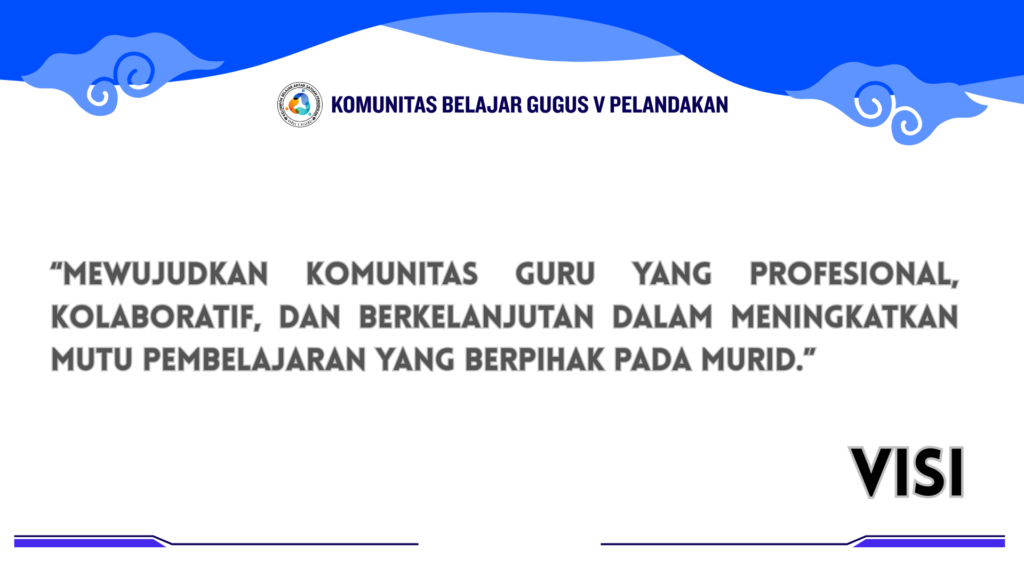Bersama Komunitas Belajar Gugus V Pelandakan, kami bertekad mewujudkan guru yang profesional, kolaboratif, dan berkelanjutan demi masa depan terbaik bagi murid-murid kita.Visi kami sebagai panduan aksi dalam berkomitmen membangun Komunitas Belajar Gugus V Pelandakan yang terus tumbuh, berkolaborasi, dan berinovasi. Tujuan akhirnya adalah meningkatkan mutu pembelajaran yang sepenuhnya berpihak pada murid.
