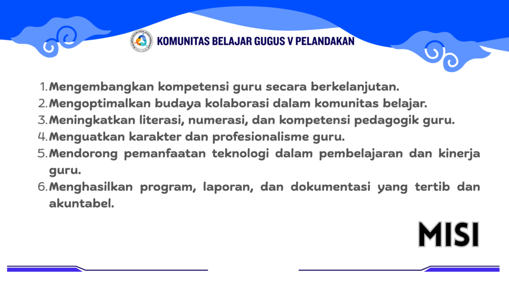 Inilah 6 Misi nyata kami di Komunitas Belajar Gugus V Pelandakan untuk mewujudkan visi guru yang profesional dan berkelanjutan.