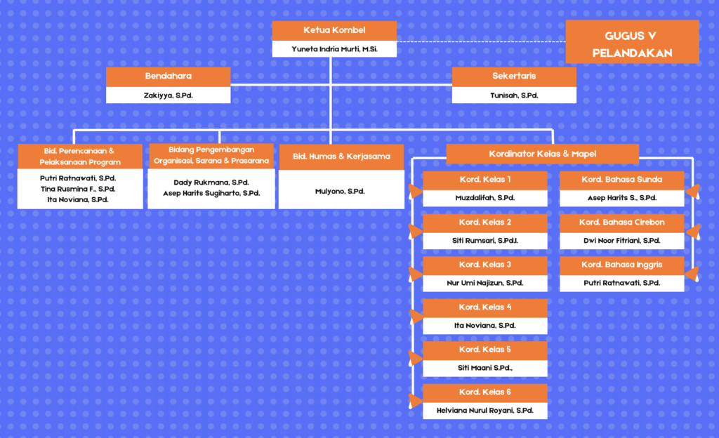 Struktur organisasi ini menggambarkan susunan kepengurusan Komunitas Belajar Antar Satuan Pendidikan Gugus V Pelandakan. Struktur ini menjadi pedoman kerja bersama untuk memperkuat kolaborasi, meningkatkan profesionalisme guru, dan mengoptimalkan program peningkatan kualitas pendidikan di Gugus V Pelandakan. Melalui kolaborasi ketua, sekretaris, bendahara, para ketua bidang, koordinator kelas, dan koordinator mapel, kami berkomitmen menghadirkan pembelajaran yang lebih bermakna, berkualitas, dan berdampak bagi peserta didik. Hal lain yang tidak kalah penting adalah komunikasi dengan Ketua Gugus dan jajarannya berupa koordinasi dan konsultasi untuk pengembangan kegiatan kombel yang lebih adaptif dan bermanfaat bagi sekolah-sekolah di Gugus V Pelandakan.